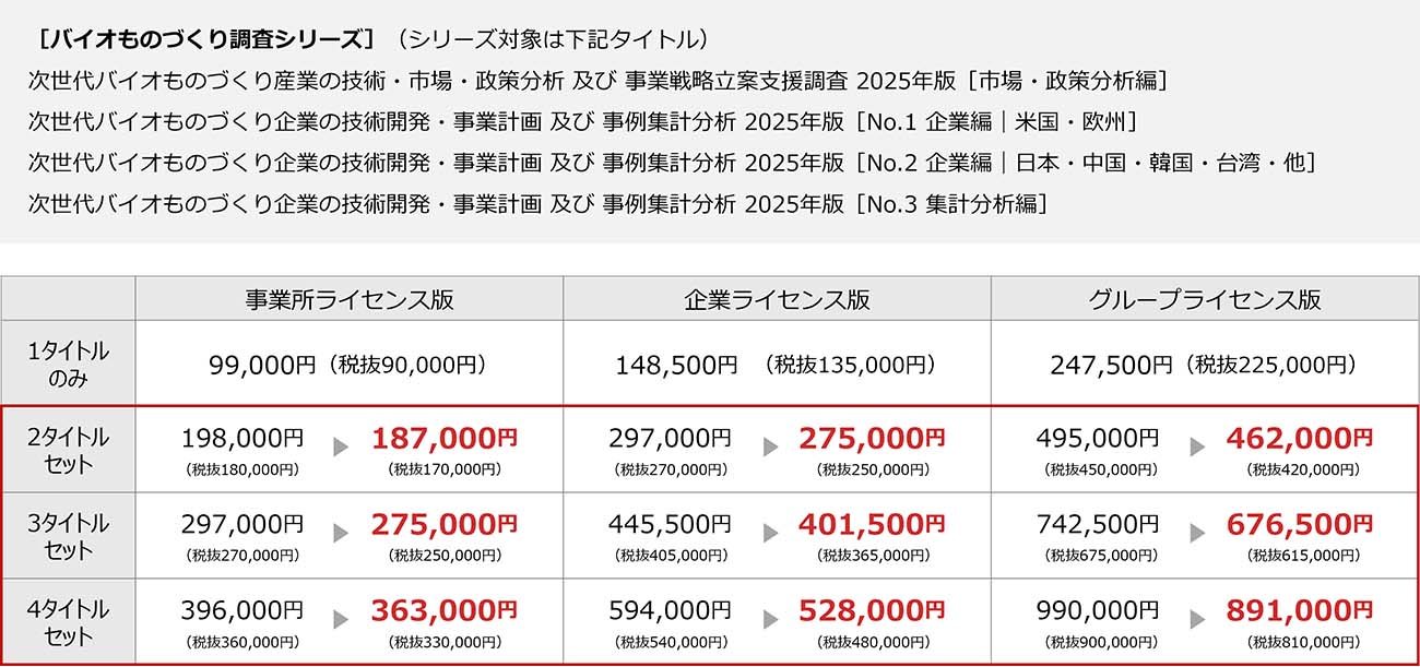 バイオものづくりシリーズ2025のセット購入で、後で購入した方の税抜価格から下記金額を引いてご請求書を発行します。※ご請求書はタイトルごとに分けて発行可
